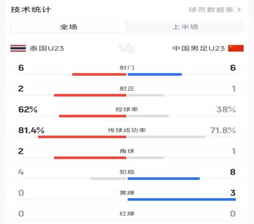 U23国足00泰国半场数据:U23国足6射1正,38%控球率3人染黄