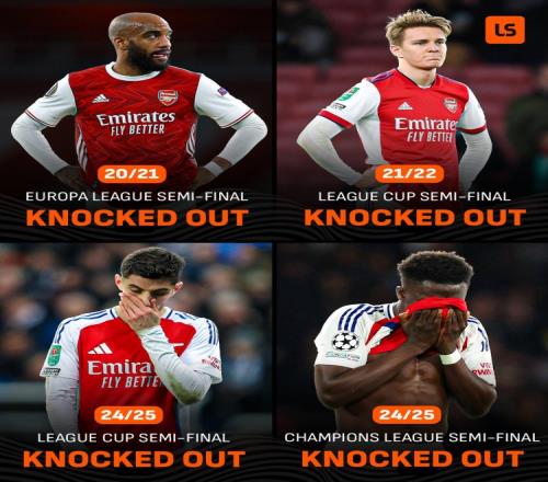 据Live Score统计,阿森纳各项赛事近4次半决赛皆出局,这是该俱乐部历史上最长的半决赛连续出局纪录。